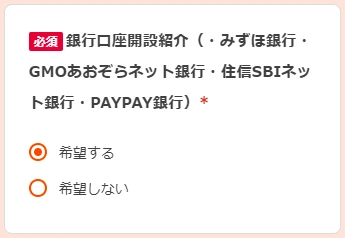 弊社のお申し込みフォームにて、「銀行口座開設紹介を希望する」にチェックを入れていただきます。