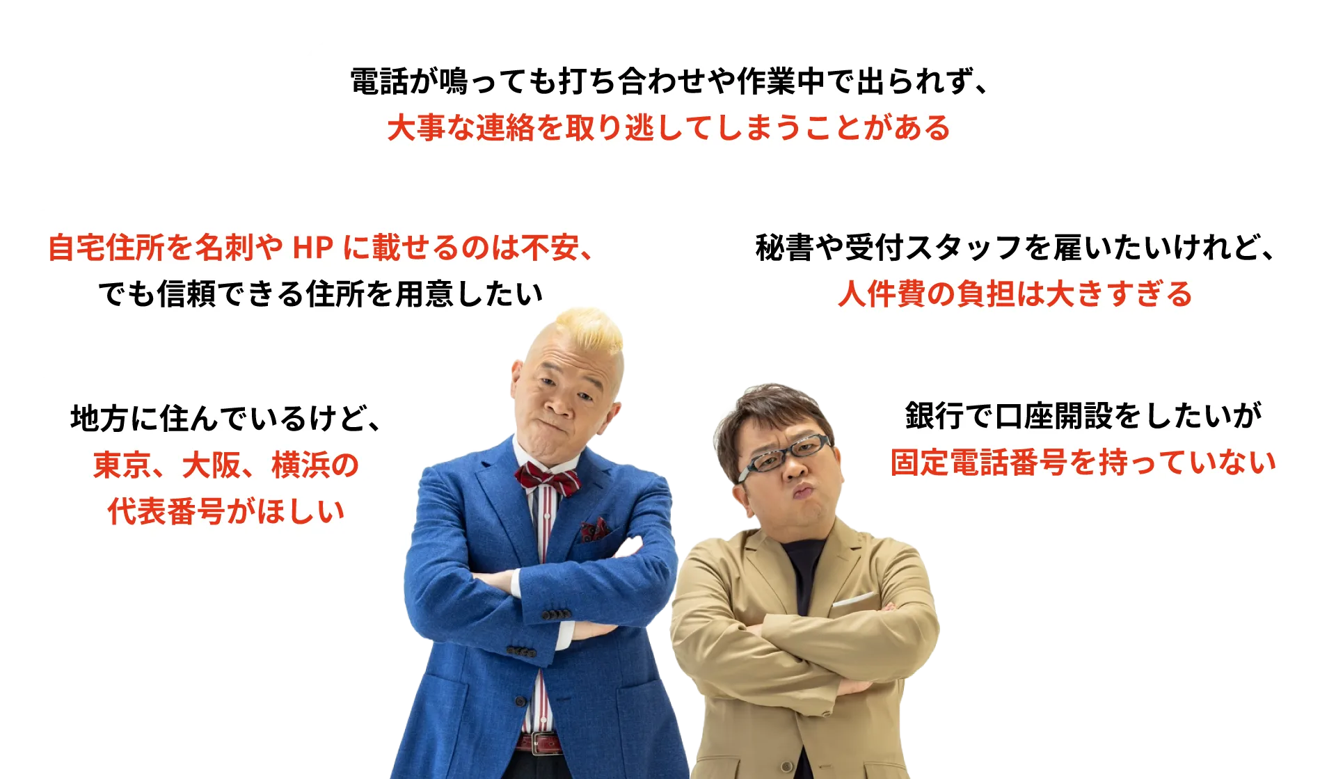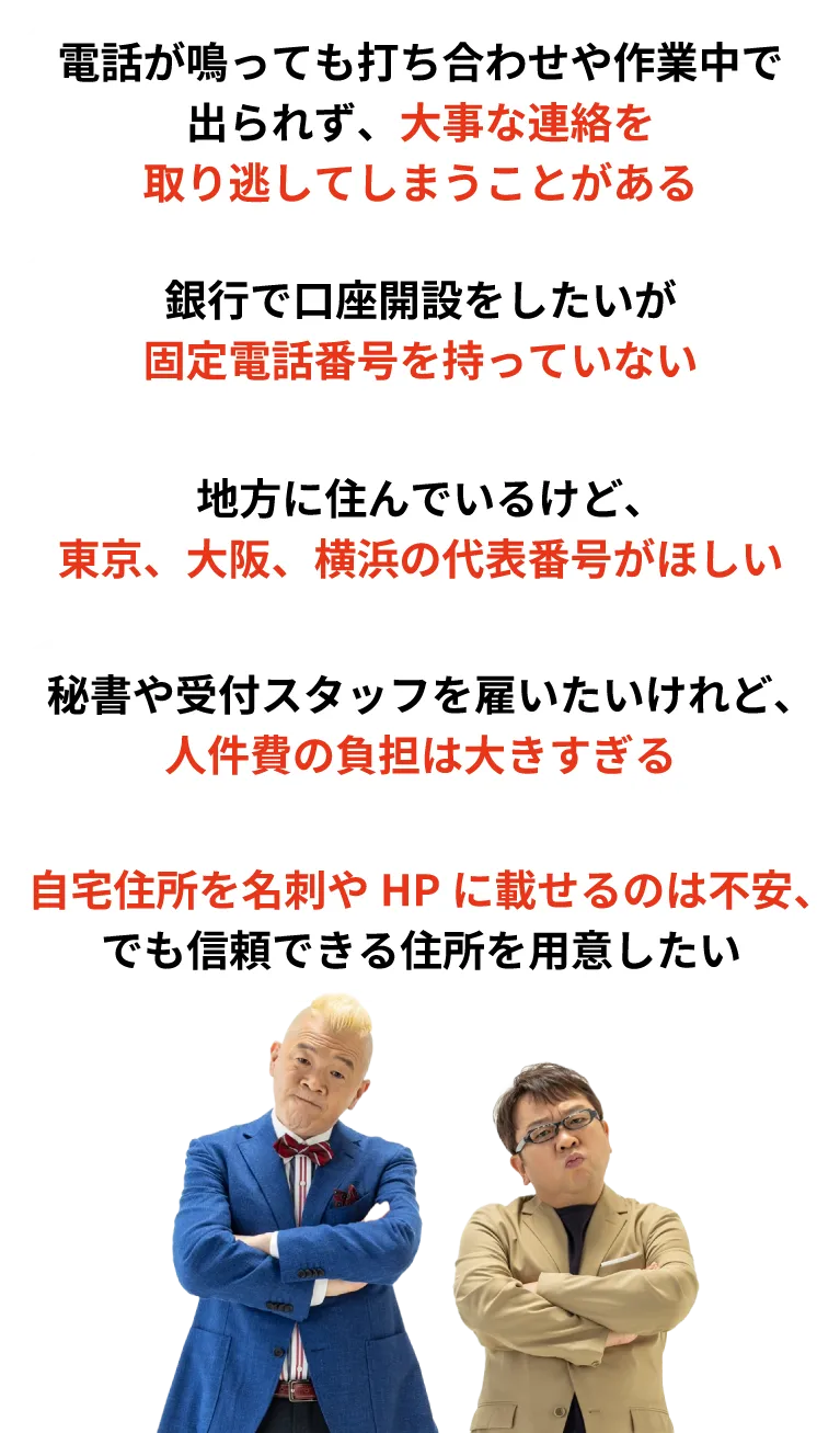 銀行や税務署などへの届け出番号・名刺・ホームページなどに専用の固定電話番号を掲載したい。外回りが多く電話に出れない、電話対応をプロに任せたいという方にオススメです。